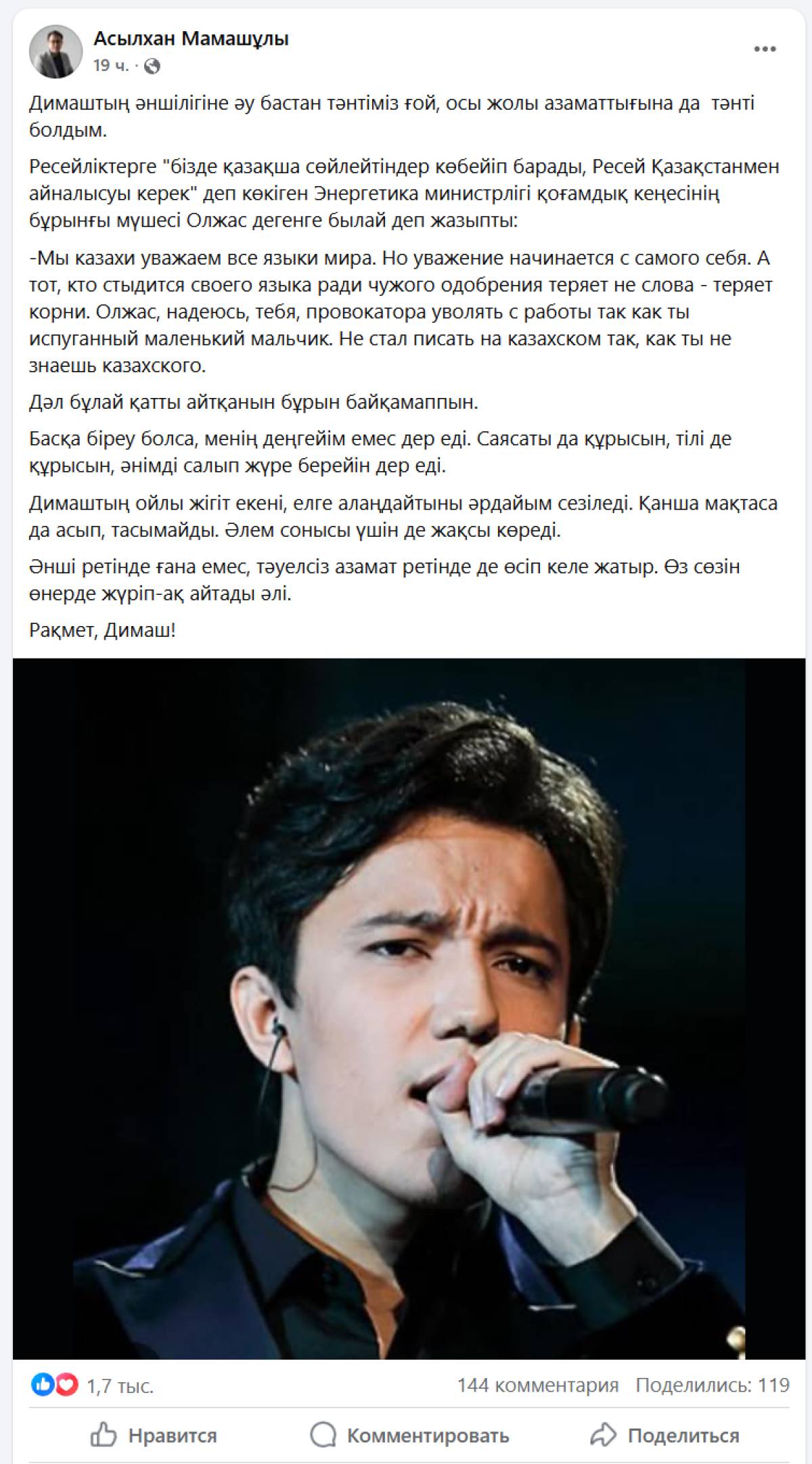 "Димаштың әншілігіне әу бастан тәнтіміз ғой, осы жолы азаматтығына да тәнті болдым. Ресейліктерге "бізде қазақша сөйлейтіндер көбейіп барады, Ресей Қазақстанмен айналысуы керек" деп көкіген Энергетика министрлігі қоғамдық кеңесінің бұрынғы мүшесі Олжас дегенге былай деп жазыпты: "Мы казахи уважаем все языки мира. Но уважение начинается с самого себя. А тот, кто стыдится своего языка ради чужого одобрения теряет не слова – теряет корни. Олжас, надеюсь, тебя, провокатора уволять с работы так как ты испуганный маленький мальчик. Не стал писать на казахском так, как ты не знаешь казахского". Дәл бұлай қатты айтқанын бұрын байқамаппын. Басқа біреу болса, менің деңгейім емес дер еді. Саясаты да құрысын, тілі де құрысын, әнімді салып жүре берейін дер еді. Димаштың ойлы жігіт екені, елге алаңдайтыны әрдайым сезіледі. Қанша мақтаса да асып, тасымайды. Әлем сонысы үшін де жақсы көреді. Әнші ретінде ғана емес, тәуелсіз азамат ретінде де өсіп келе жатыр. Өз сөзін өнерде жүріп-ақ айтады әлі. Рақмет, Димаш!" – деп жазды Асылхан Мамашұлы.