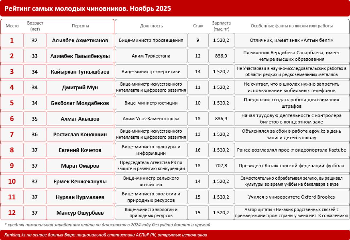 Қазақстандағы ең жас жоғары дәрежедегі шенеунік – Оқу-ағарту вице-министрі Асылбек Ахметжанов. Ол тәуелсіздік жылдары туған, "Алтын белгі" иегері атанған, бар-жоғы 9 жыл ішінде түрлі министрліктерде жетекші сарапшыдан басқарма басшысына дейін өскен.