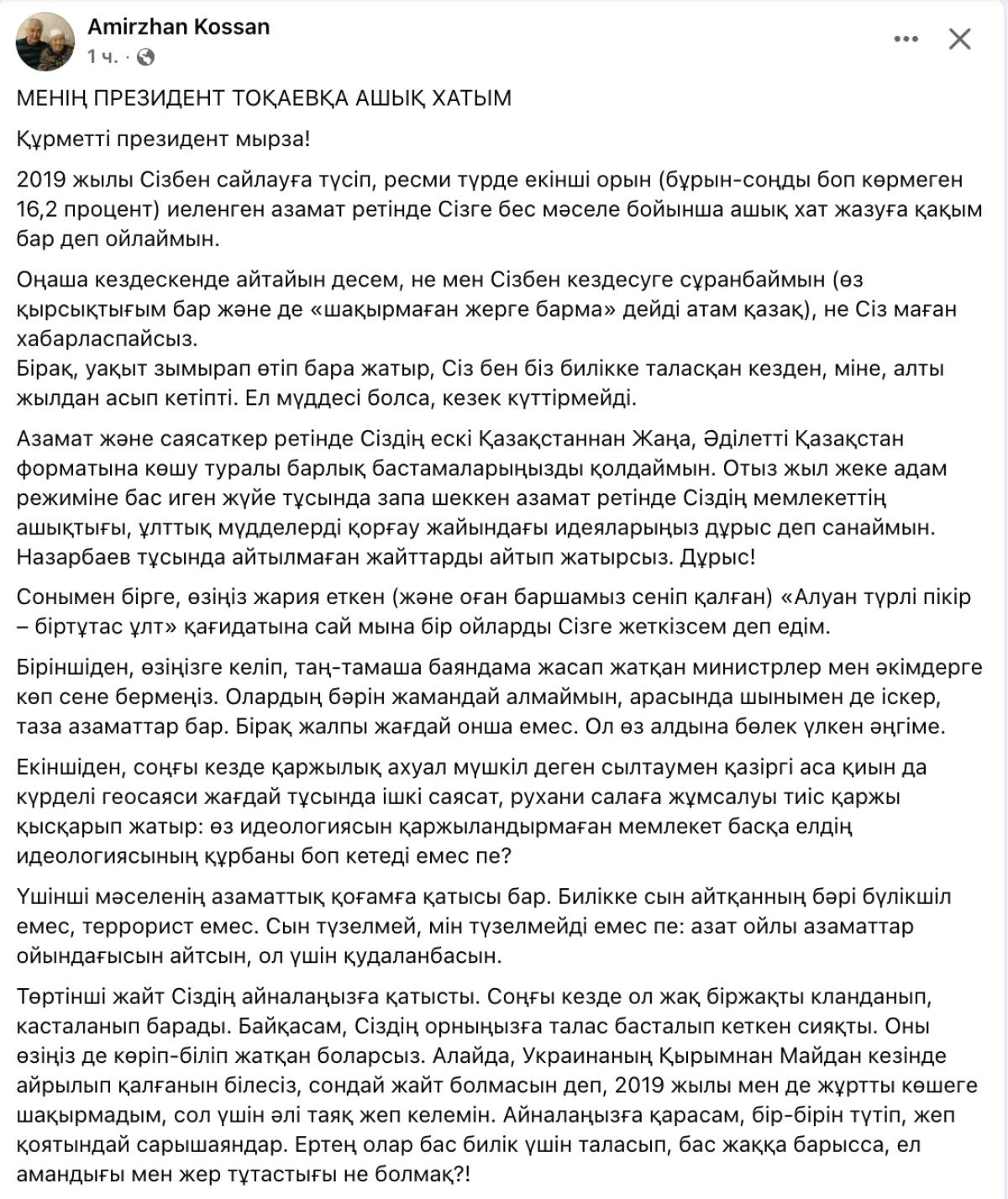 Белгілі саясаткер әрі журналист, Қазақстандағы президент сайлауына түсіп, үміткер болған Әміржан Қосанов Мемлекет басшысына ашық хат жазды және оны Facebook әлеуметтік желісінде жариялады деп, хабарлайды arasha.kz.