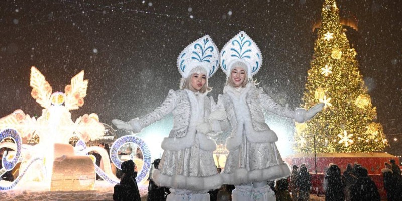 Қаланың жаңа жылдық бас шыршасының шамын жағу рәсімінің алдында Республика сарайының қасбетінде екі минуттық лазерлік шоу көрсетілді.