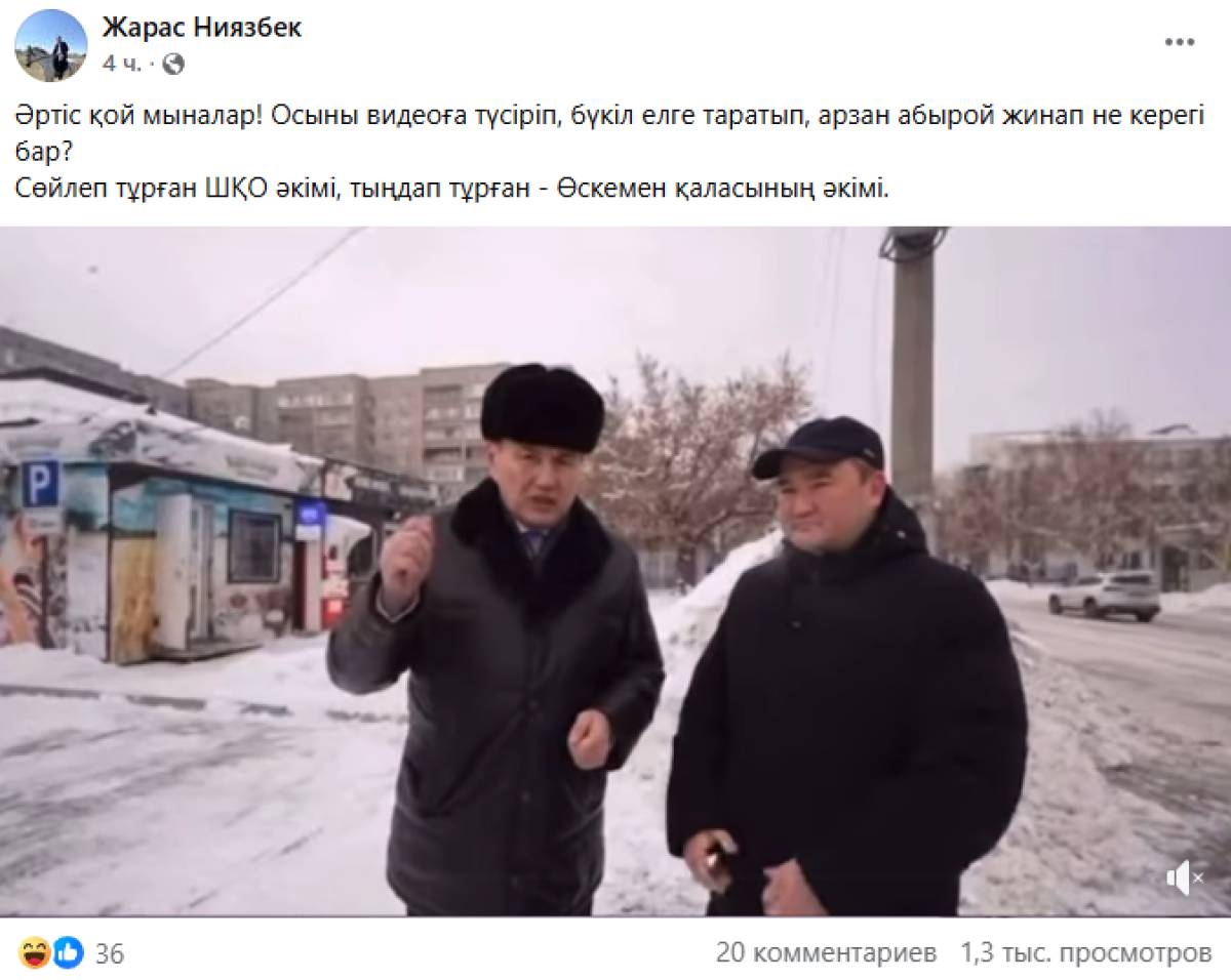 "Әртіс қой мыналар! Осыны видеоға түсіріп, бүкіл елге таратып, арзан абырой жинап не керегі бар? Сөйлеп тұрған ШҚО әкімі, тыңдап тұрған – Өскемен қаласының әкімі", – деп жазды Жарас Ниязбек.