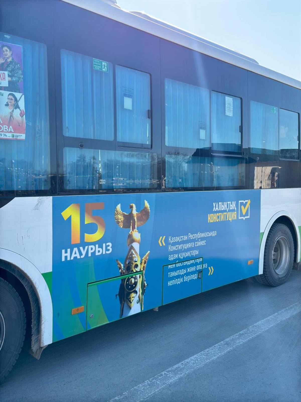 Қоғамдық көліктерді тақырыптық материалдармен безендіру ақпаратты барынша үлкен аудиторияға жеткізуге мүмкіндік береді: жолаушылар конституциялық өзгерістер мен алдағы республикалық референдум туралы түсіндірмелерді күн сайын жол үстінде көре алады.