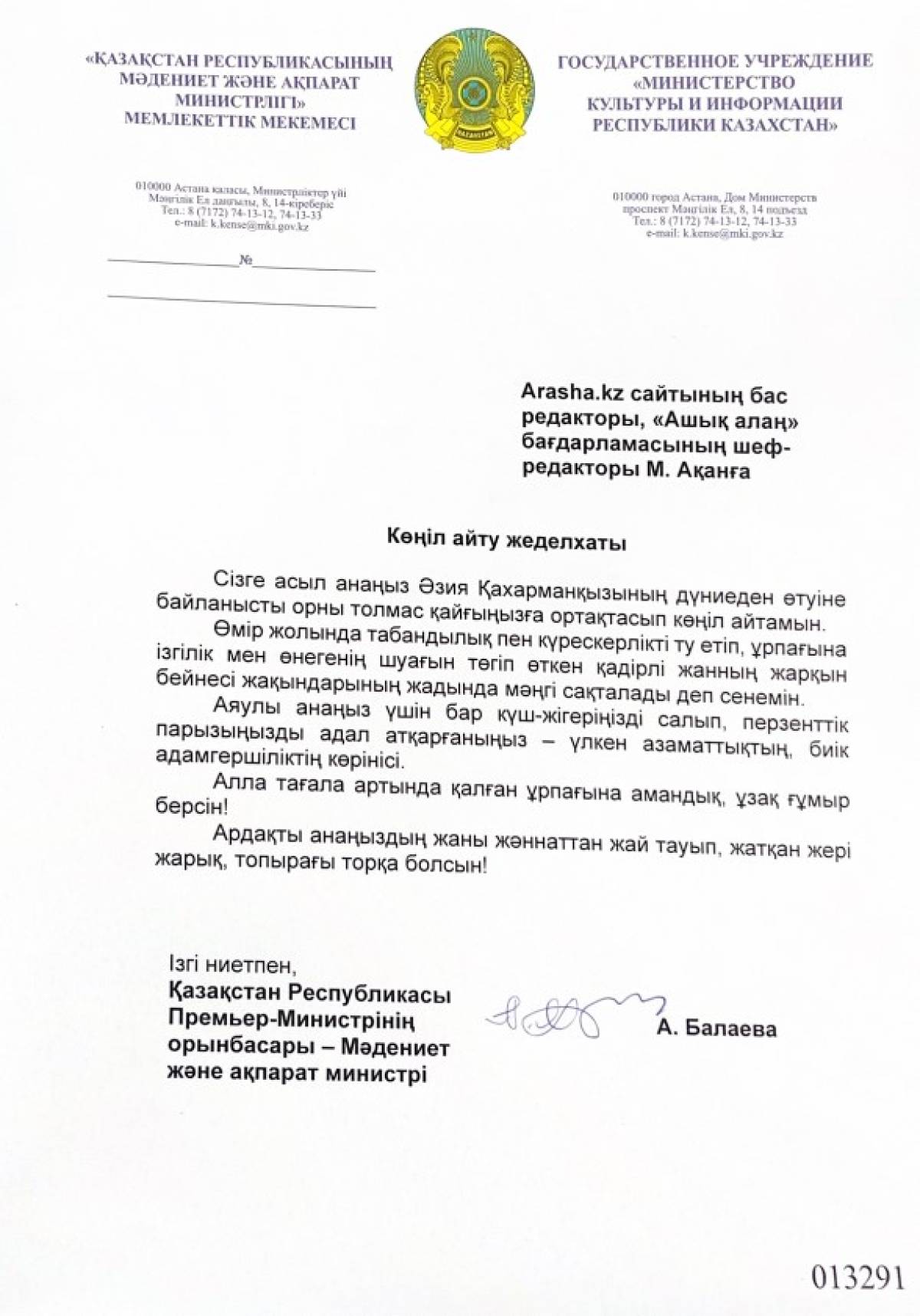 «Arasha.kz» ақпараттық-сараптамалық сайтының ұжымы бас редактор Марғұлан Ақанға ардақты анасы Әзия Қахарманқызының дүниеден өтуіне байланысты қайғысына ортақтасып, шын жүректен көңіл айтады.