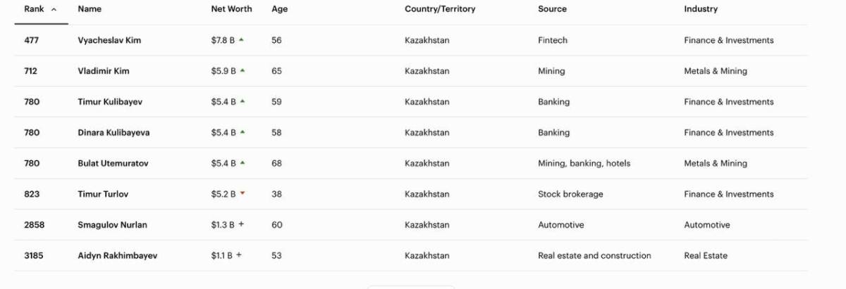 Керісінше, Тимур Турлов позициясын жоғалтты. Оның капиталы 5,8 млрд доллардан 5,2 млрд долларға дейін қысқарып, тізімдегі орны 605-тен 823-ке түсті.
