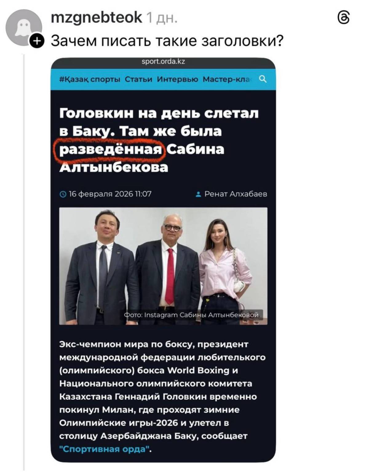 Өкінішке қарай, соңғы уақытта гендерлік теңсіздік тақырыбын қоздырған бірнеше кейс болды. Ең алдымен, біраз уақыт бұрын кейбір спорт сайттары «Ажырасқан Сабина Алтынбекова ұлымен мақтанды», «Ажырасқан Сабина да Головкиннің жиынында болды» дегендей кликбейт тақырыптармен қоғамды дүрліктірді. Бұған танымал спортшы наразылығын білдіріп: «Ажырасқан». Спортшы емес. Әйел емес. Тұлға емес. Тек «ажырасқан». Ал ажырасу таңба емес, бұл өмірдің бір кезеңі. Мен әйелмін. Мен анамын. Мен кәсіби маманмын. Қазақстан әйелдері өзгенің сценарийімен өмір сүруге міндетті емес. Біз өз өмірімізді таңдауға құқылымыз. Жапсырмасыз, қысымсыз, кемсітусіз» деп жауап берді. Сондай-ақ, ақпаратты жариялаған сайттардан 7 күнде кешірім сұрауды талап етті. Олай болмаған жағдайда сотқа жүгінетінін жеткізді. Кликбейт қоғам наразылығын туғызды.