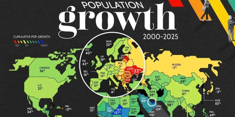 2000–2025 жылдар аралығында дүние жүзі халқы 6,1 миллиардтан 8 миллиардтан асты. Бірақ бұл өсім барлық елдерде бірдей болмады – Парсы шығанағы елдері мен Африка жарылыстай өсіп жатса, Шығыс Еуропа мен Балтық елдері халқынан айрылуда. Дүниежүзілік банк пен БҰҰ-ның жаңа деректері бойынша, соңғы 25 жылда жер шарының халқы шамамен 30 пайызға өсті – жалпы есепте 183 ел өсті, 32 ел азайды.